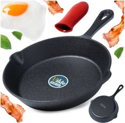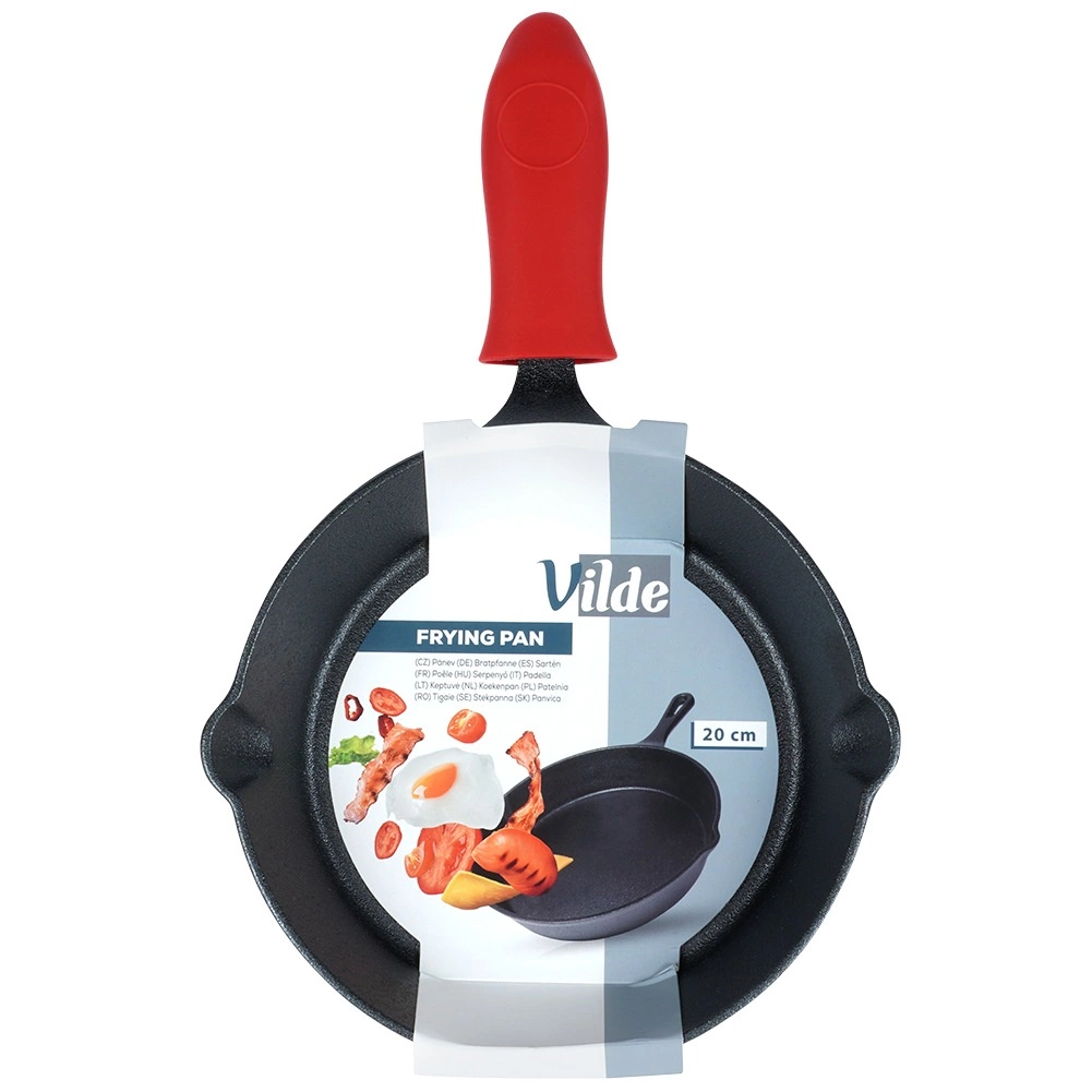 Ova kompaktna lijevanoželjezna tava od 20 cm idealna je za prženje, pirjanje, pečenje i posluživanje priloga. Masivno tijelo od lijevanog željeza brzo se i ravnomjerno zagrijava te dugo zadržava toplinu, pa hrana ostaje dulje topla i sočna. Dva praktična izlijevna ruba olakšavaju izlijevanje umaka ili masnoće, a crveni silikonski navlak povećava sigurnost pri rukovanju.