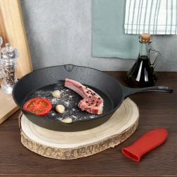 Ova potpuno lijevana tava u crnoj boji idealna je za prženje, pirjanje i pečenje. Lijevano željezo se zagrijava ravnomjerno i dugo zadržava visoku temperaturu, pa odresci, povrće i krumpir dobivaju savršenu strukturu i ostaju dulje topli. Silikonski navlak u crvenoj boji osigurava siguran hvat bez rizika od opeklina.