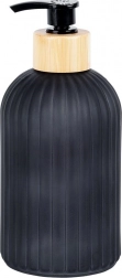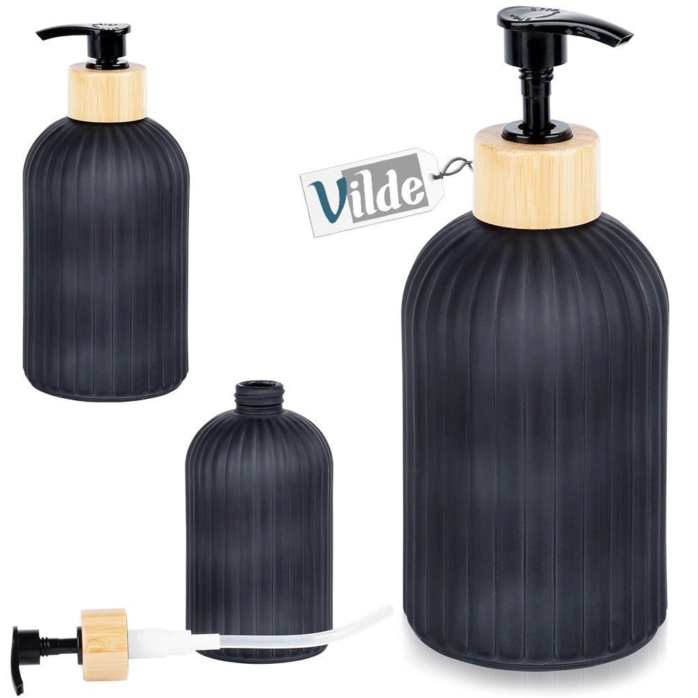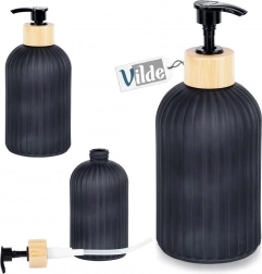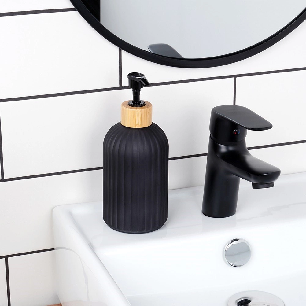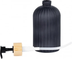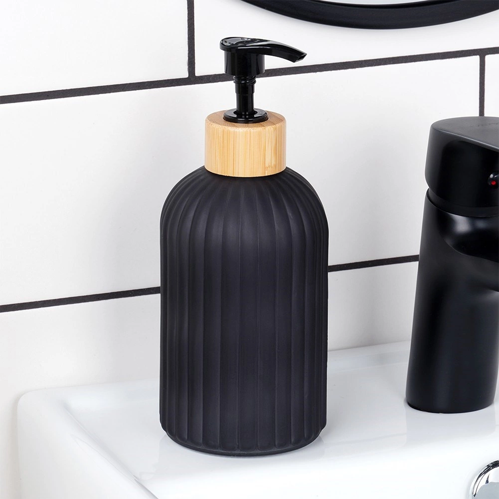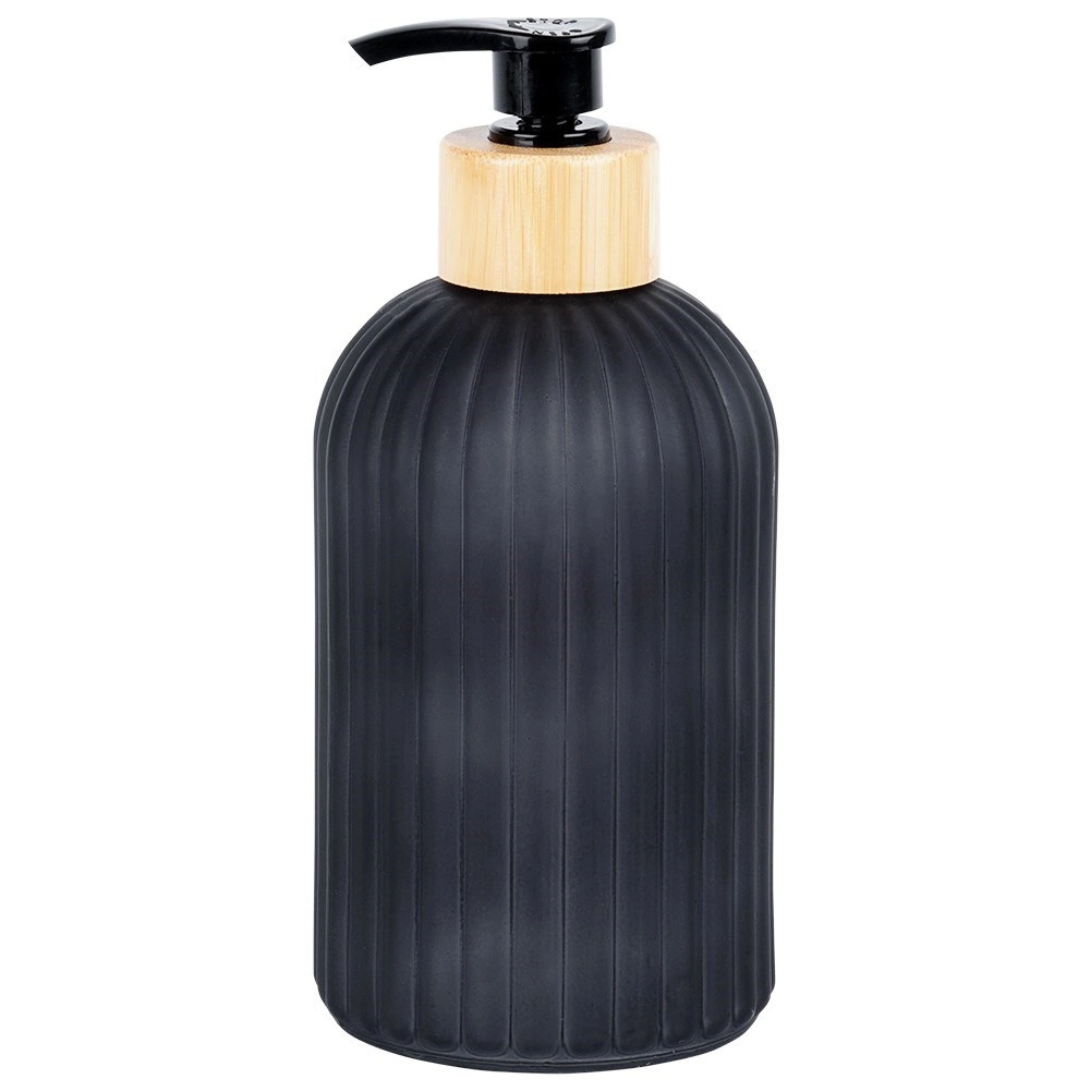 Stilski dozator za tekući sapun ili deterdžent za posuđe kombinira izdržljivo staklo s mat crnom površinom i prirodnim bambusnim akcentom. Vertikalno rebranje daje moderan izgled i istovremeno poboljšava prihvat. Odgovara kupaonici i kuhinji, a zahvaljujući čistim linijama lako se uklapa u suvremene interijere.