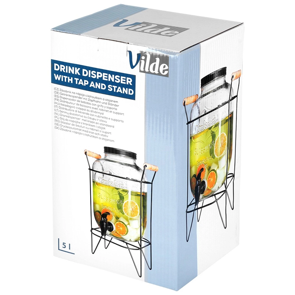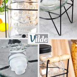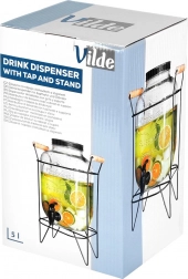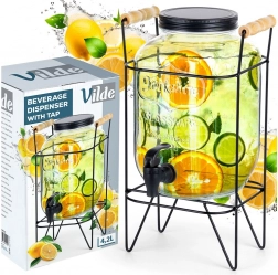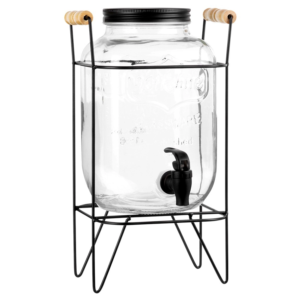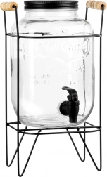 Elegantan dozator od kvalitetnog debelog stakla ističe se na svakom stolu i olakšava posluživanje gostiju. Povišeni stalak od mat metala s drvenim ručkama pruža prostor za čaše ispod pipca i osigurava stabilnost. Crni navojni poklopac štiti napitak od insekata i nečistoća.