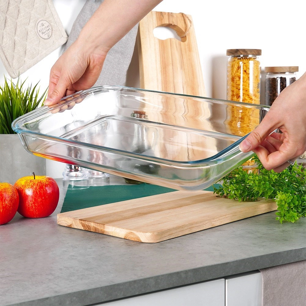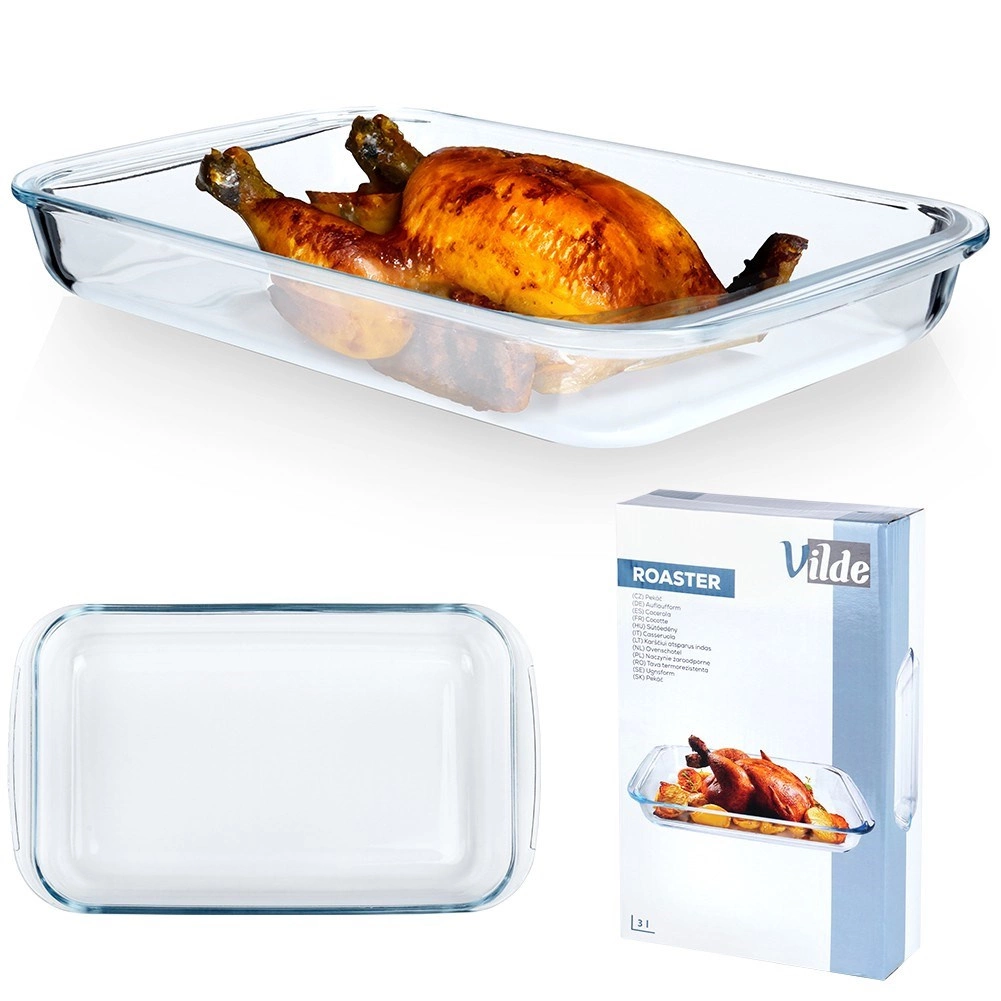 Ova pravokutna posuda za pečenje od debelostijenog borosilikatnog stakla odlično provodi toplinu i omogućuje vam kontrolu nad jelom zahvaljujući potpuno prozirnim stijenkama. Prikladna je za sve vrste pećnica i mikrovalnih pećnica, kao i za hladnjak i zamrzivač. Glatka površina olakšava čišćenje i pogodna je za perilicu posuđa.