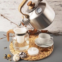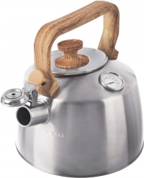 Ovaj klasični čajnik od nehrđajućeg čelika s bezvremenskim izgledom dizajniran je za brzo zagrijavanje vode i preciznu kontrolu temperature. Ugrađeni analogni termometar pomaže vam postaviti idealnu temperaturu za različite vrste čajeva i bilja, dok zviždaljka sigurno upozorava na dostizanje vrenja. Ergonomska drška u imitaciji drveta ugodna je na dodir i osigurava udobno rukovanje.