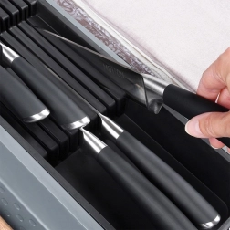 Poseban blok s pojedinačnim utorima drži noževe odvojene, zaštićene i uvijek pri ruci. Štedi prostor i povećava sigurnost u ladici.