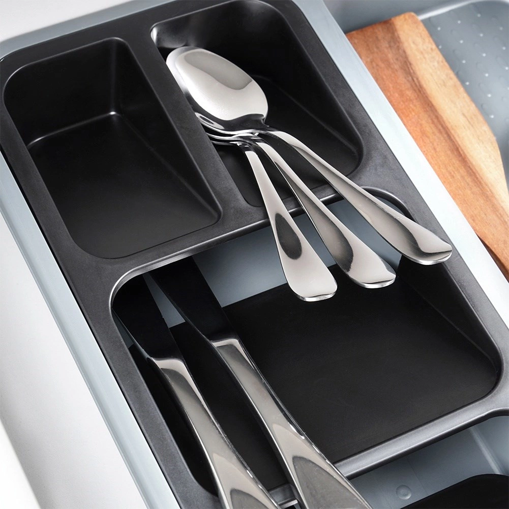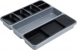 Unutrašnjost središnjeg pretinca ima protukliznu površinu koja sprječava klizanje pribora i alata. Kvalitetna plastika u sivoj boji s crnim umetcima je izdržljiva, lako se održava i može se prati u perilici posuđa. Idealan dodatak svakoj kuhinji koji štedi prostor i ubrzava pripremu jela.