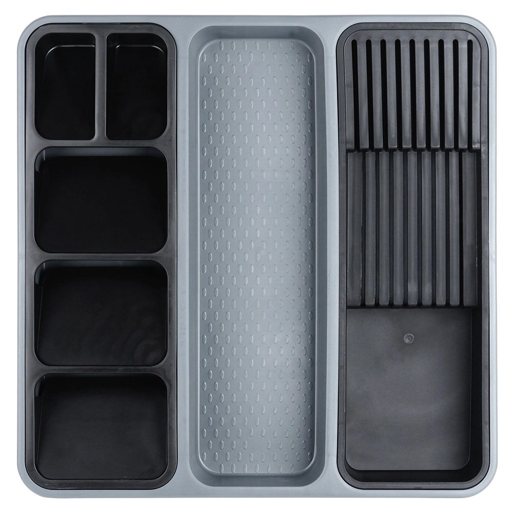 Organizirajte svoju kuhinju u trenu. Ovaj sivi organizator dimenzija 40 × 40 × 5 cm nudi pametan raspored pretinaca, uključujući izvadive umetke – jedan je namijenjen za do 9 noževa, drugi za pregledno razvrstavanje pribora za jelo. Zahvaljujući tome, svaki komad ostaje na svom mjestu i u ladici uvijek vlada red.