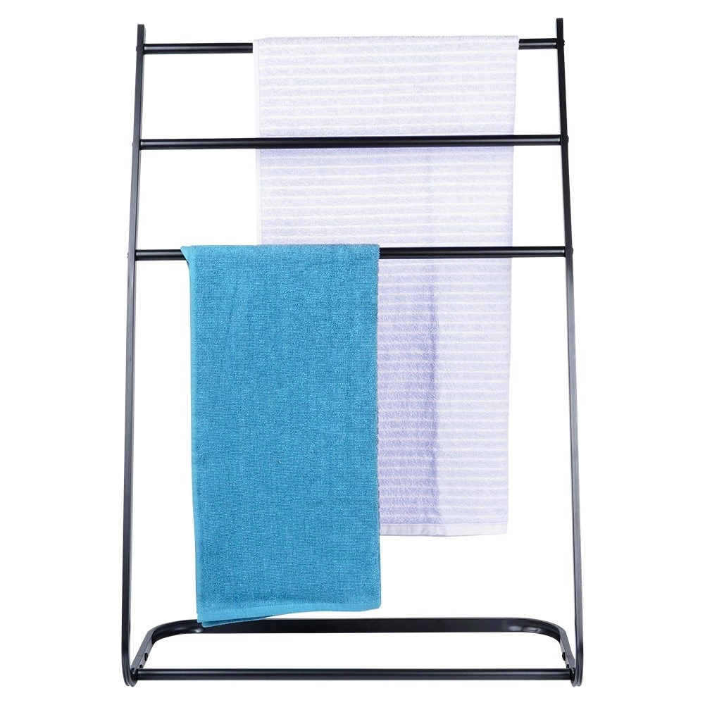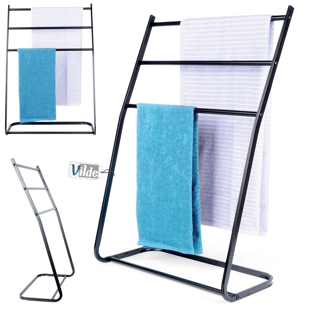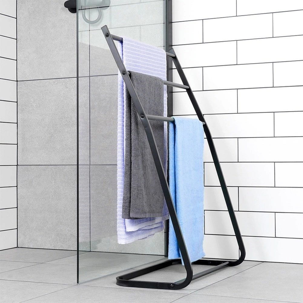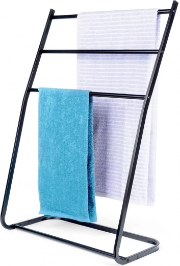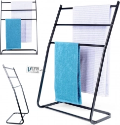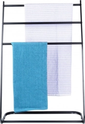 Samostojeći metalni stalak za ručnike ili odjeću nudi tri čvrste prečke na različitim razinama za optimalan protok zraka i brže sušenje. Minimalistički dizajn u crnoj boji djeluje čisto i bezvremenski, pa se odlično uklapa u kupaonice modernog i klasičnog stila.