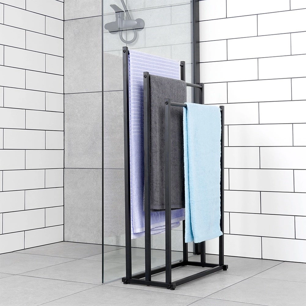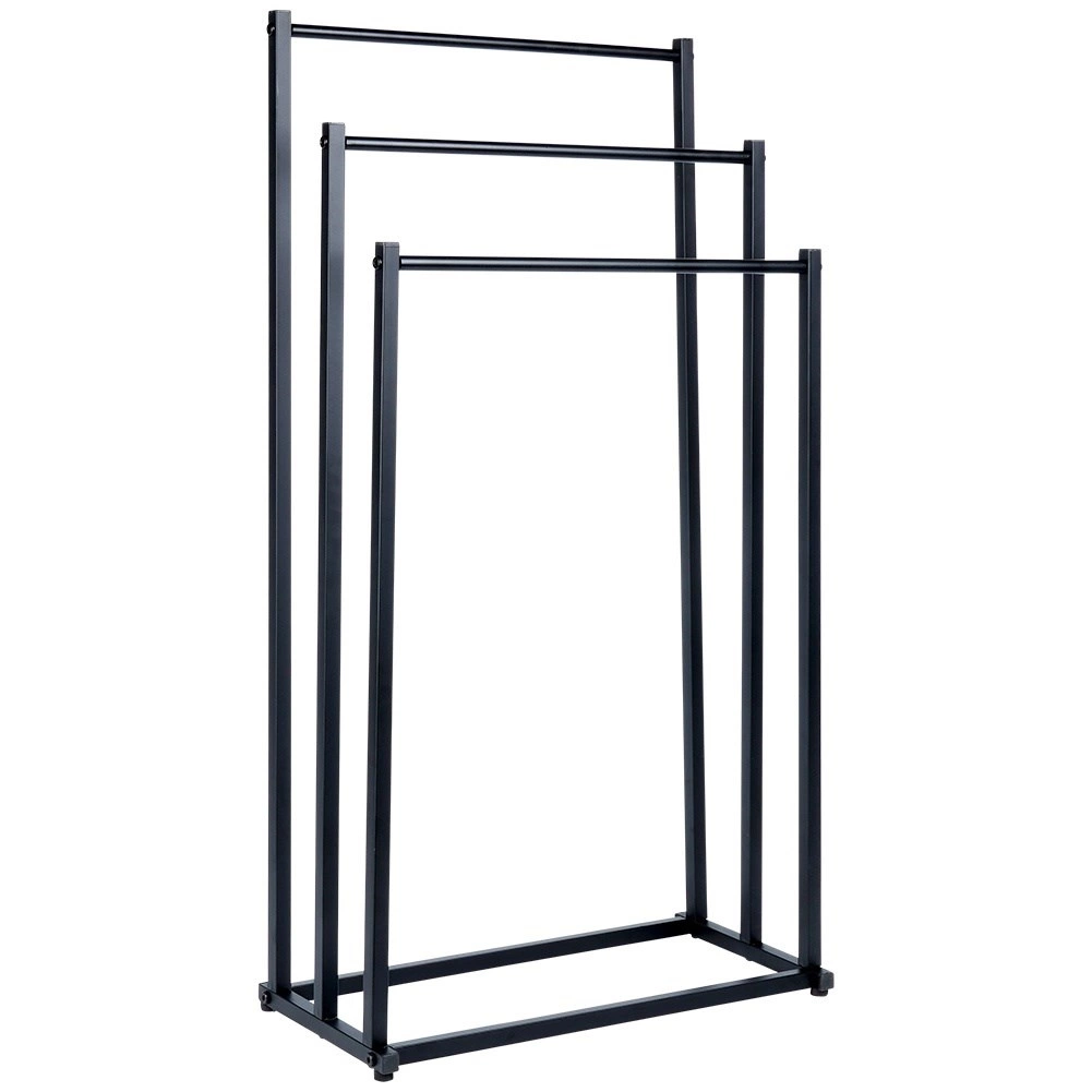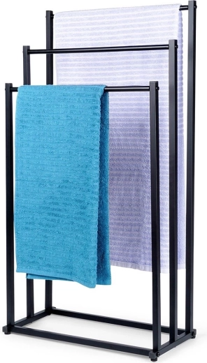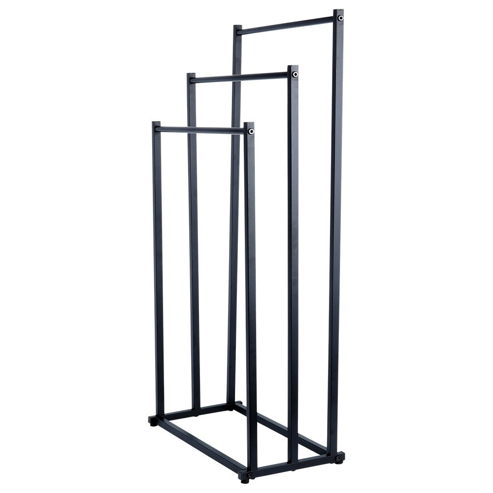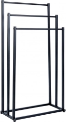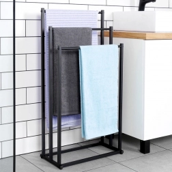 Praktični samostojeći stalak za ručnike ili odjeću s tri stepenasto raspoređene prečke osigurava pregledno odlaganje i bolju cirkulaciju zraka za brže sušenje. Minimalistički izgled u mat crnoj odlično se uklapa u moderne interijere i daje kupaonici industrijski karakter.