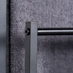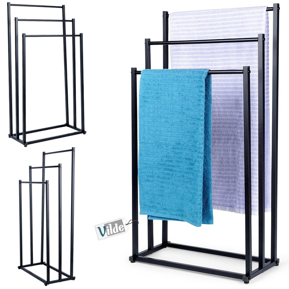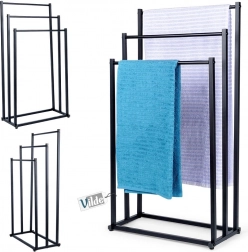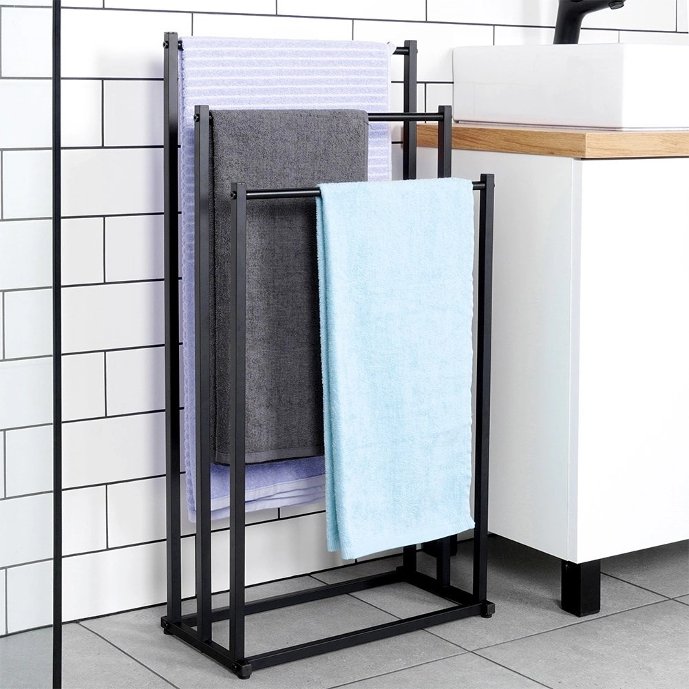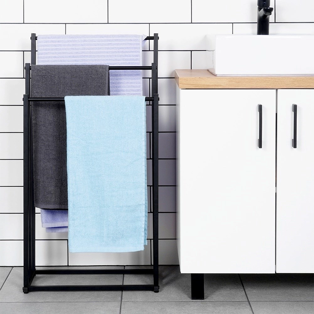 Praktični samostojeći stalak za ručnike ili odjeću s tri stepenasto raspoređene prečke osigurava pregledno odlaganje i bolju cirkulaciju zraka za brže sušenje. Minimalistički izgled u mat crnoj odlično se uklapa u moderne interijere i daje kupaonici industrijski karakter.