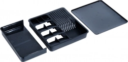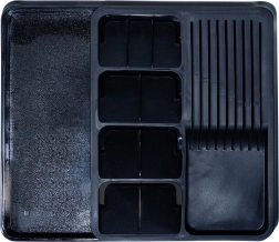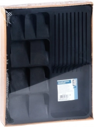 Organizator je izrađen od kvalitetne, čvrste plastike u elegantnoj crnoj boji, lako se pere i otporan je na svakodnevnu upotrebu. Idealan izbor za moderne kuhinje, gdje cijenite red, brz pristup alatima i sigurnu pohranu oštrih oštrica.