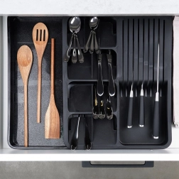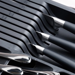 Održavajte ladice savršeno preglednima. Proširivi umetni organizator za ladicu nudi pametan raspored pretinaca za žlice, vilice, noževe i kuhinjski alat te namjenski blok za sigurnu pohranu do devet noževa. Zahvaljujući proširivom dijelu, lako prilagođavate širinu prostora za pohranu i iskorištavate svaki centimetar ladice.