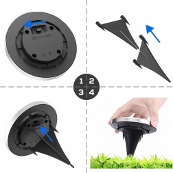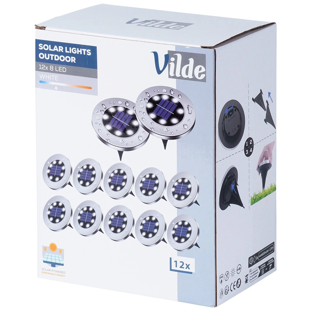Svako svjetlo ima 8 snažnih LED-ica s bijelom bojom svjetla, izdržljivu konstrukciju sa zaštitom IP44 i jednostavnu ugradnju bez alata – dovoljno je utaknuti u zemlju. Nakon potpunog punjenja (otprilike 6–8 h) svijetli približno do 6 sati. Upravljanje osiguravaju prekidač ON/OFF i senzor sumraka.