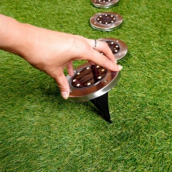 Diskosna solarna svjetla s okvirom od nehrđajućeg čelika i crnim zemnim klinom neupadljivo se uklapaju u travnjak ili šljunak te navečer pouzdano osvjetljavaju staze i rubove gredica. Puni se suncem, nakon sumraka se automatski pale i osiguravaju sigurno navođenje i ugodnu atmosferu.
