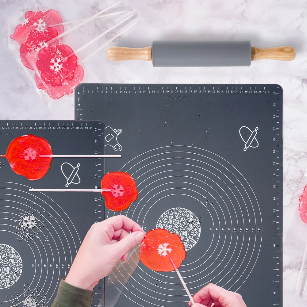 Valjak s rotirajućim drvenim ručkama odlično leži u ruci i omogućuje glatko i ravnomjerno valjanje bez nepotrebnog napora. Podloga se može koristiti i kao podloga za pečenje u pećnici ili za pohranu tijesta u hladnjaku ili zamrzivaču. Za uštedu prostora lako je smotate ili presavijete.