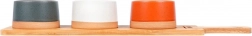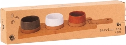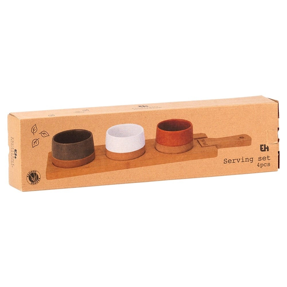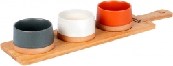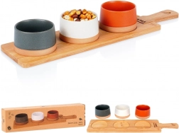 Ovaj elegantan set zdjelica s bambusovom daskom idealan je za posluživanje zalogaja, antipastija, dipova i umaka. Zahvaljujući urezanim mjestima za zdjelice sve ostaje stabilno i pri prenošenju. Minimalistički dizajn ističe se u modernim i tradicionalnim domovima te je sjajan prijedlog za poklon za useljenje.