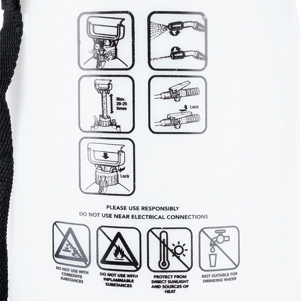 Zapremnina 5 litara za dulji rad bez čestog dolijevanja. Ručna pumpa lako stvara radni tlak do 3,2 bara, a ventil za pretlak povećava sigurnost.