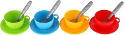 Čajnik, 4 šalice, 4 tanjurića, 4 žličice (šarena kombinacija)
