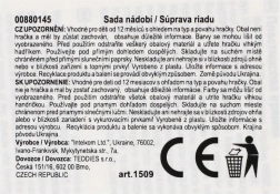 Set sadrži sve potrebno za malu čajanku: čajnik, šalice s tanjurićima i žličice u veselim bojama. Pakirano u praktičnoj mrežici, koja olakšava pospremanje i prenošenje. Prikladno od 12 mjeseci.