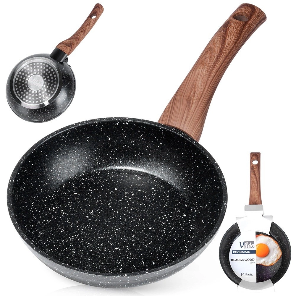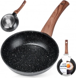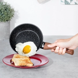 Ova univerzalna tava od aluminijskog odljevka s granitnim neljepljivim slojem idealna je za prženje i pirjanje manjih porcija – jaja, povrća ili mesa. Stilsko izdanje u crnoj boji s drvenim izgledom ručke odlično se uklapa u modernu kuhinju i olakšava svakodnevnu pripremu jela.