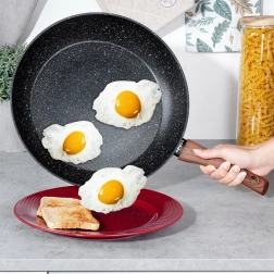 Otkrijte univerzalnu tavu BLACK & WOOD koja kombinira izdržljiv aluminijski odljevak i moderan granitni neprianjajući premaz. Zahvaljujući velikom promjeru od 32 cm lako priprema porcije za cijelu obitelj, i to s minimalnom količinom ulja. Elegantni crni dizajn s drvenim dekorom savršeno pristaje svakoj kuhinji.