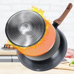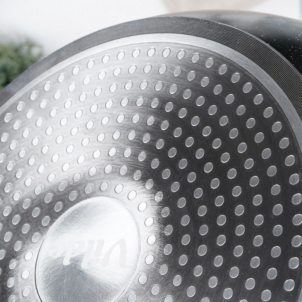 Masivni aluminijski odljev osigurava brzo i ravnomjerno zagrijavanje, što štedi vrijeme i energiju. Neljepljiva granitna površina minimalizira zagorijevanje i olakšava čišćenje. Ergonomska drška s protukliznom obradom ne zagrijava se tijekom kuhanja, a otvor na kraju olakšava vješanje.