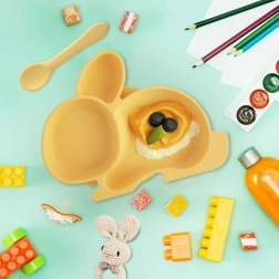 Pretvorite svaki obrok u zabavu i red. Silikonski tanjurić u obliku zeke s podjelom na 3 odjeljka pomaže pregledno i higijenski poslužiti raznolika jela. Velika vakuumska podloga na donjoj strani čvrsto se drži za stol ili dječju hranilicu i smanjuje rizik od prolijevanja.