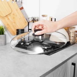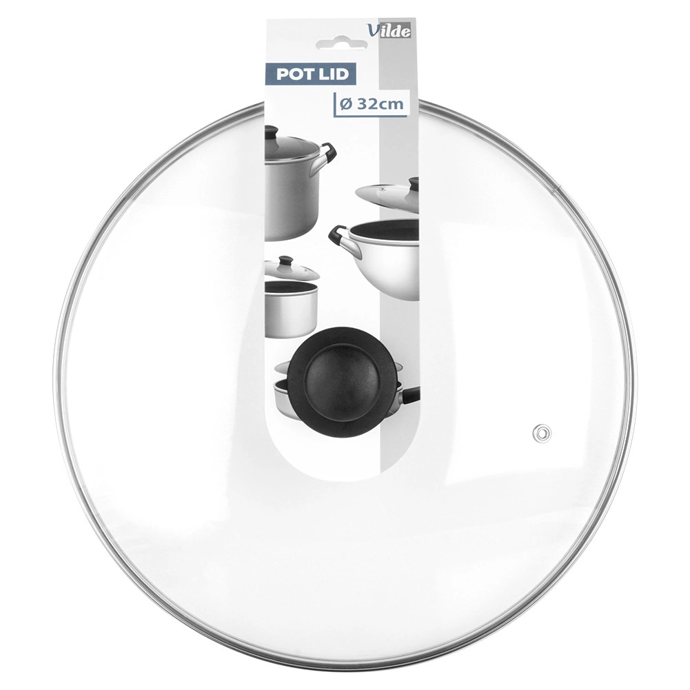 Ovaj univerzalni stakleni poklopac savršeno odgovara loncima, tavama i posudama promjera 32 cm. Zahvaljujući prozirnom vatrootpornom staklu stalno imate pregled nad tijekom kuhanja bez potrebe podizanja poklopca, što štedi energiju i vrijeme. Rub od nehrđajućeg čelika osigurava dugi vijek trajanja, a visoki rub pridonosi čvrstom i tijesnom prianjanju na posuđe.