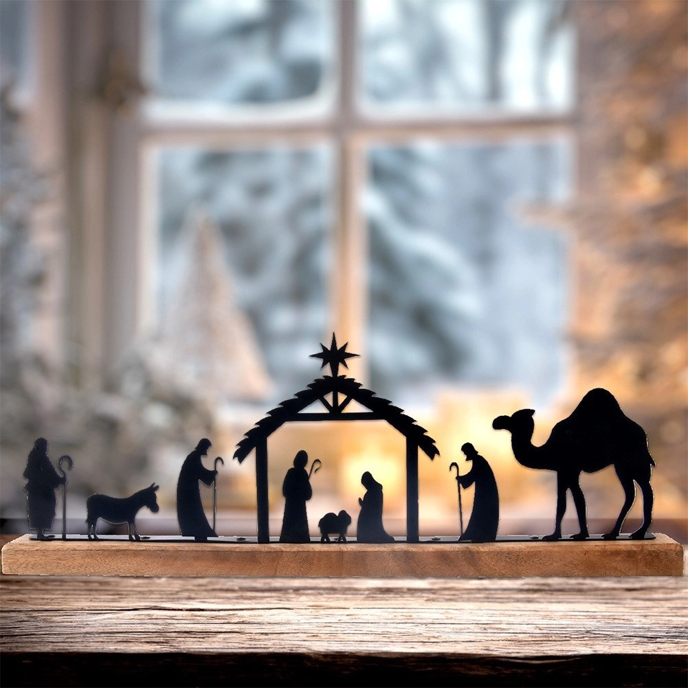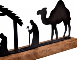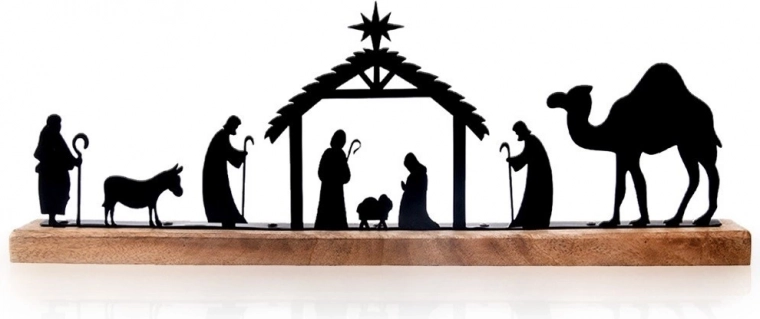 Precizno laserski izrezane crne siluete štalice, Svete obitelji, pastira, životinja i deve stvaraju izražajan, a pritom decentan blagdanski motiv.