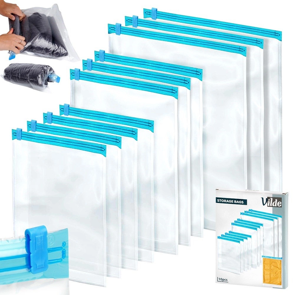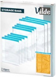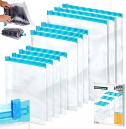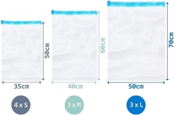 Set sadrži 10 izdržljivih kompresijskih vreća s pouzdanim kliznim zipom za višekratnu uporabu. Zahvaljujući trima veličinama, lako ćete pohraniti majice, džempere, jakne i dodatke – kako u koferu na putu, tako i u ormaru kod kuće. Prozirni materijal omogućuje brzu provjeru sadržaja bez otvaranja.