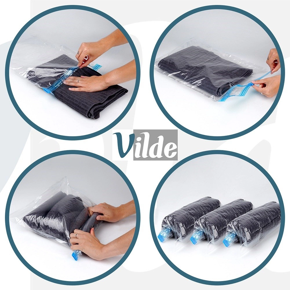 Kompresija se izvodi jednostavno bez usisavača – napunjenu vreću dovoljno je čvrsto zarolati i istisnuti zrak. Time se značajno smanjuje volumen tekstila do 70 %, poboljšava se urednost i štiti od vlage, prašine i neugodnih mirisa.
