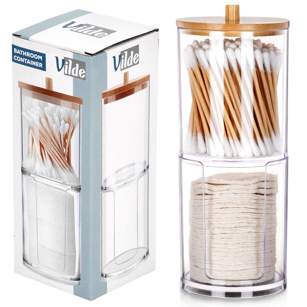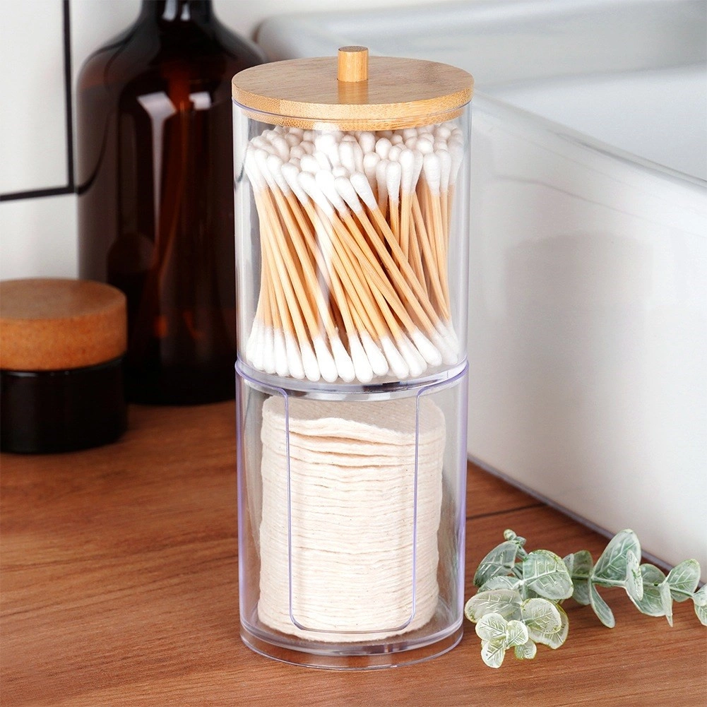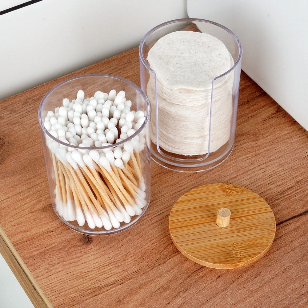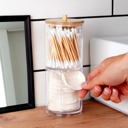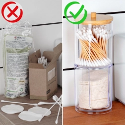 Odvojite vatirane štapiće i blazinice u jednom kompaktnom organizatoru. Prozirni materijal osigurava trenutačan pregled i elegantan izgled.