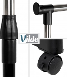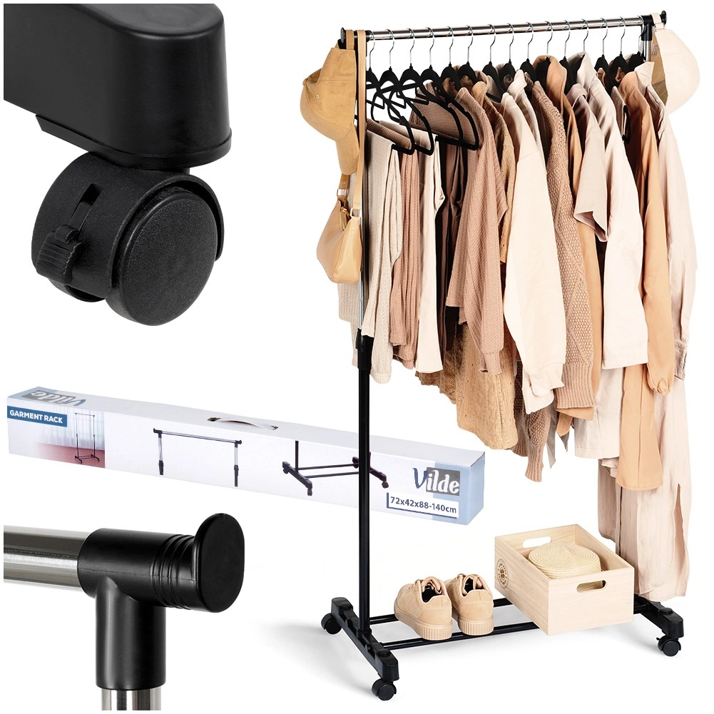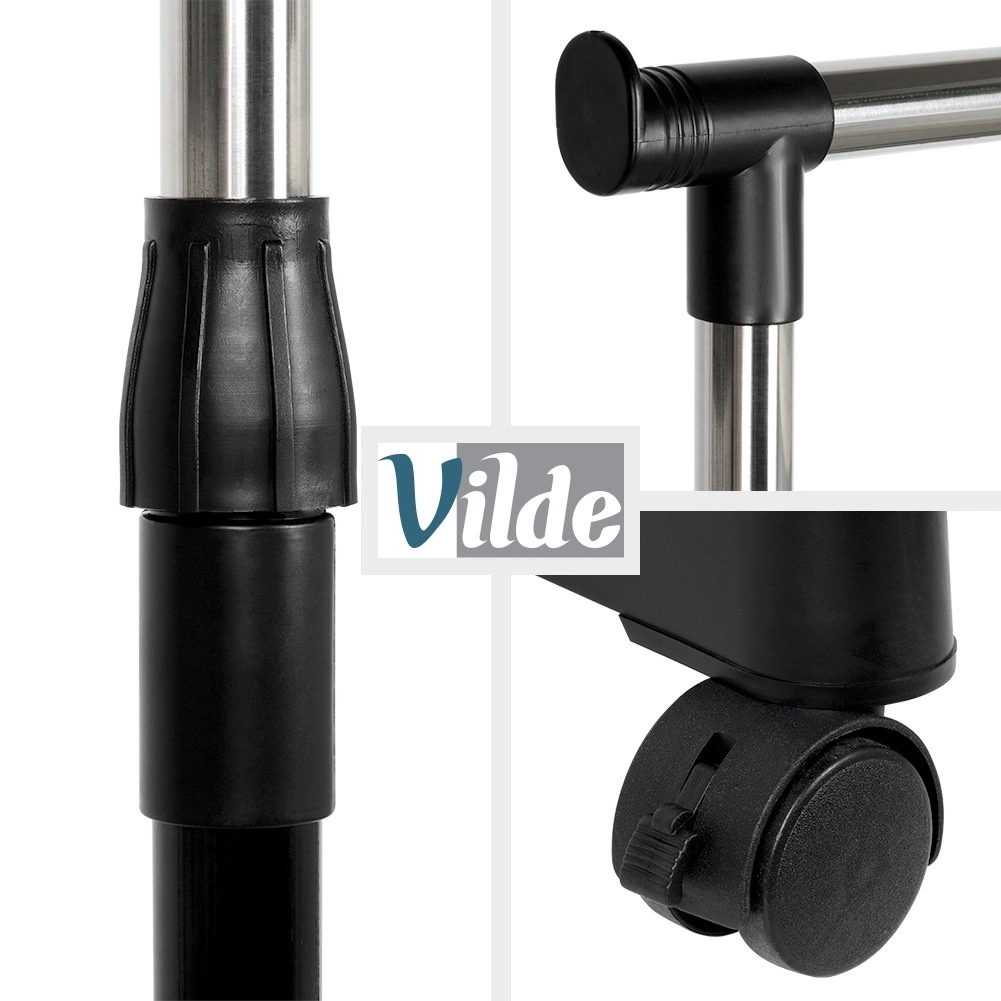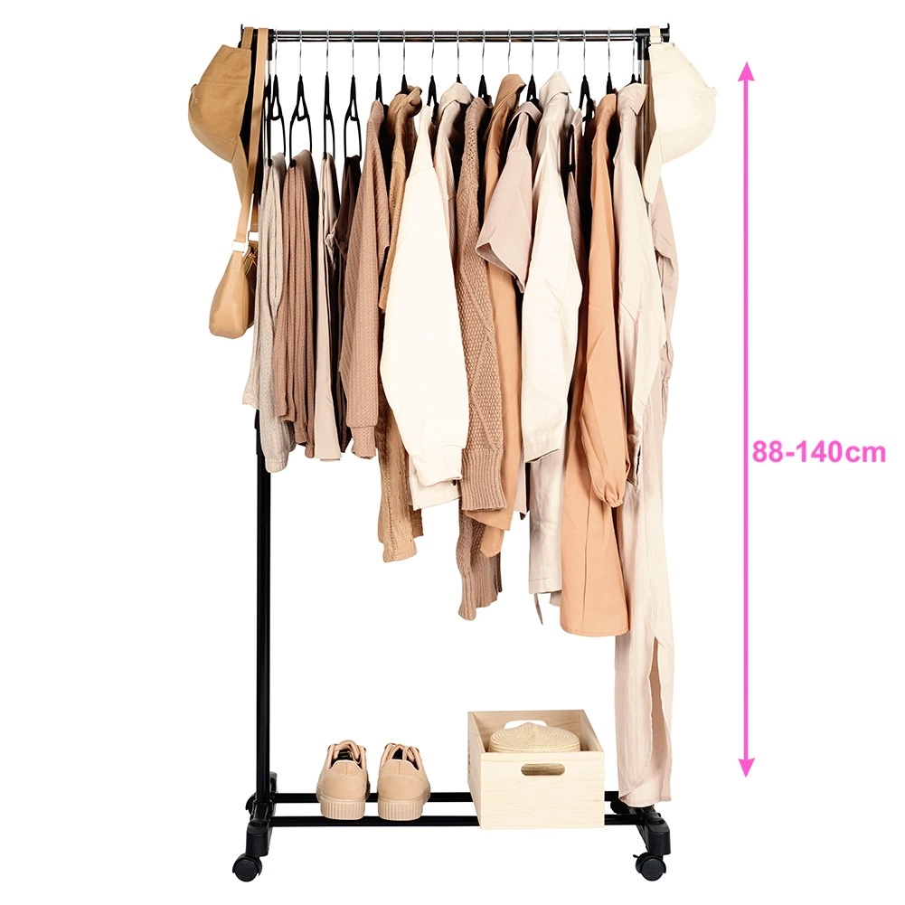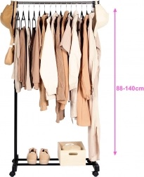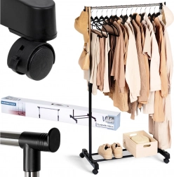 Ovaj metalni stalak u crnoj i kromiranoj izvedbi rješenje je za pregledno i stilizirano odlaganje odjeće. Robusna konstrukcija osigurava stabilnost, dok četiri okretna kotačića (2 s kočnicom) omogućuju lako rukovanje u stanu, uredu i trgovini. Zahvaljujući teleskopskom podešavanju visine 88–140 cm prilagođava se dugim kaputima i kraćim komadima.