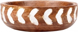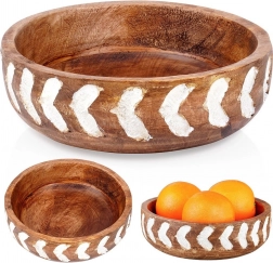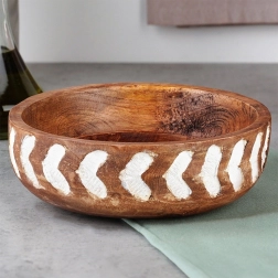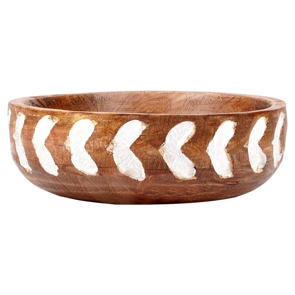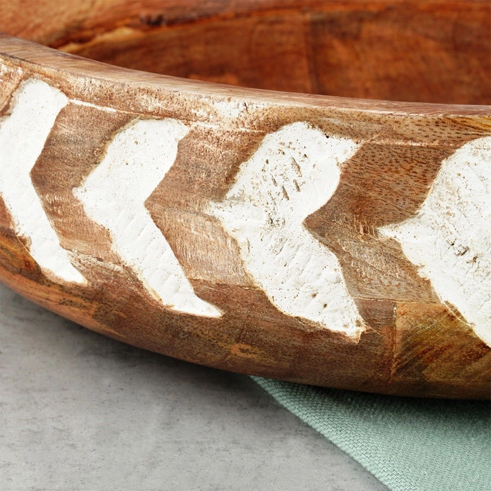 Ova zdjela od kvalitetnog mangova drva lijepo će upotpuniti vaš stol i interijer. Širok i plitak profil olakšava posluživanje salata, voća, orašastih plodova i sitnih grickalica. Ručno oslikan i rezbaren bijeli uzorak na vanjskom rubu naglašava prirodnu strukturu drva i daje zdjeli jedinstven, rustikalni karakter.