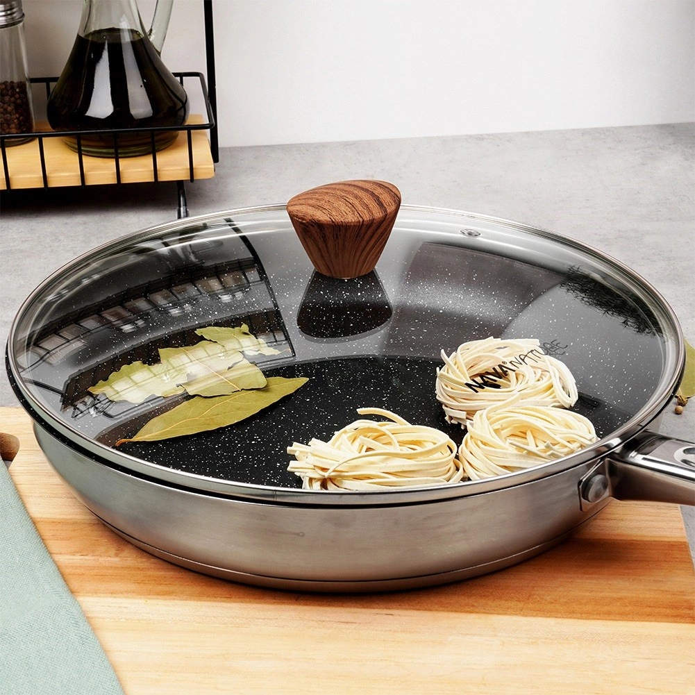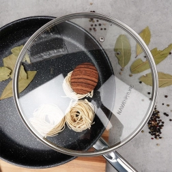 Zahvaljujući prozirnom staklu lako nadzirete jelo bez nepotrebnih toplinskih gubitaka. Otvor za paru ispušta višak, poklop je blago zaobljen za bolju cirkulaciju vrućeg zraka, a visoki rub osigurava čvrsto i tijesno prianjanje. Poklop ubrzava kuhanje, održava temperaturu i minimalizira prskanje.