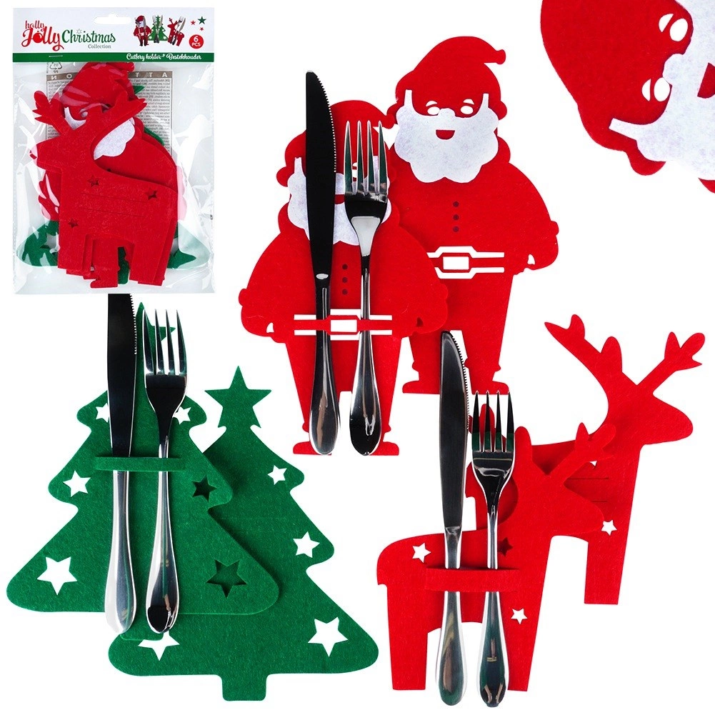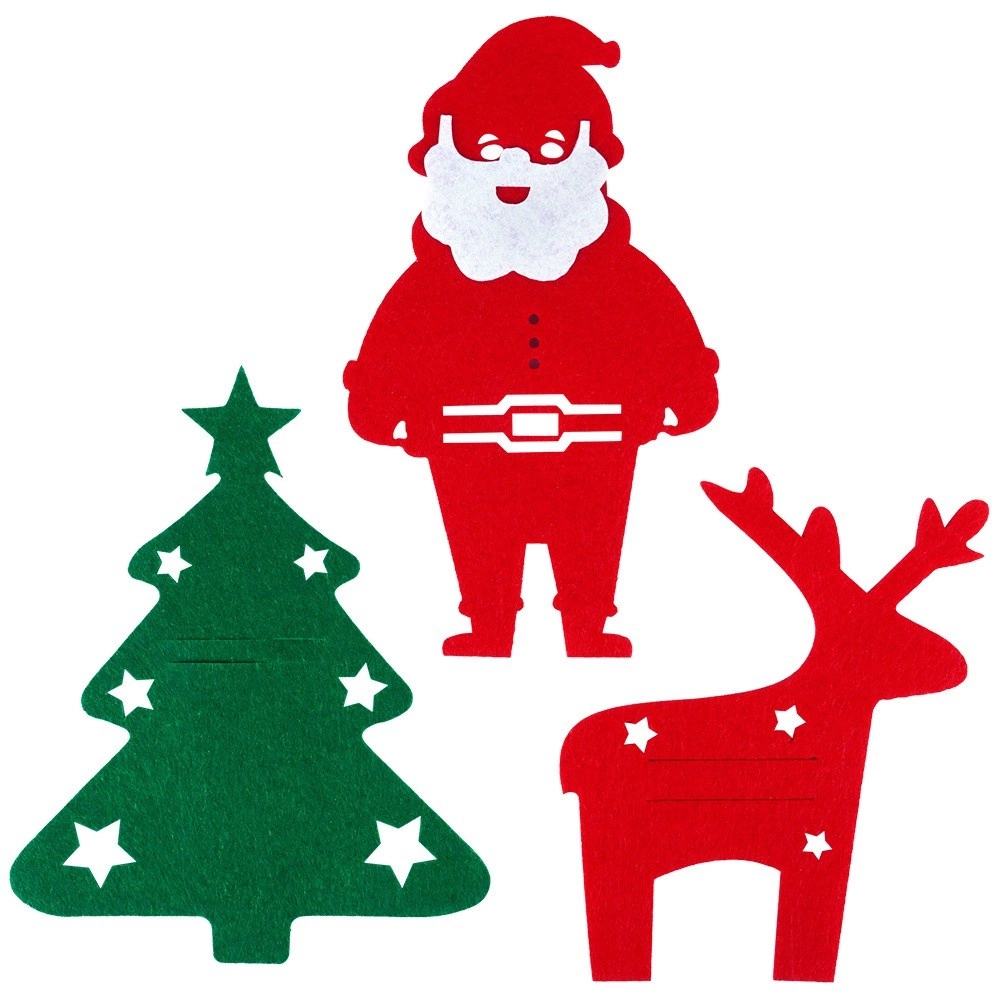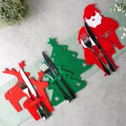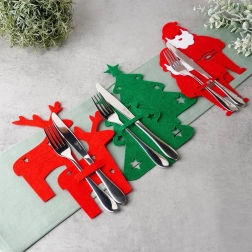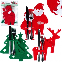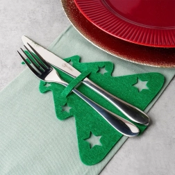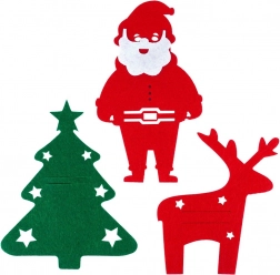 Stvorite skladnu blagdansku dekoraciju stola s dekorativnim futrolama za pribor od mekog filca. Svaka futrola ima provlak/letvicu koja pouzdano drži nož, vilicu i žlicu, a istodobno štiti površinu stola. Zahvaljujući motivima Djeda Mraza, soba i božićnog drvca, postavi dodaju razigran, ali elegantan naglasak.