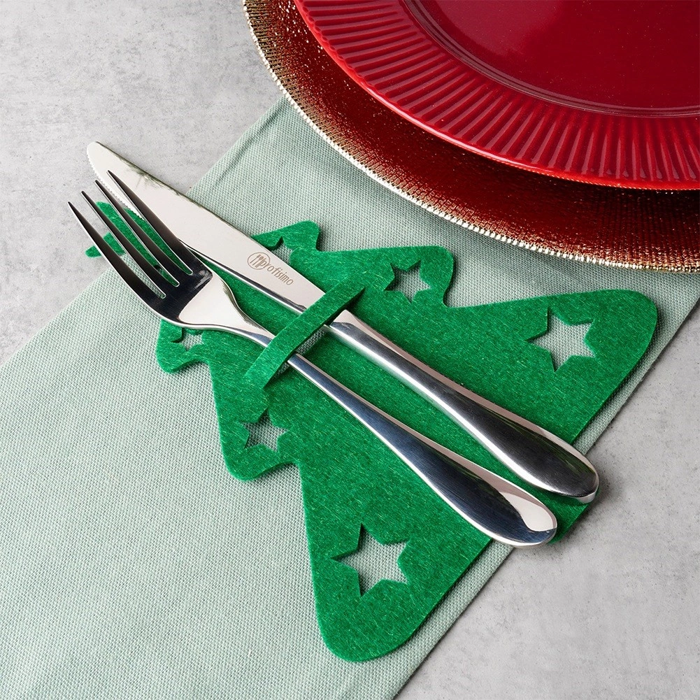 Set sadrži 6 komada u tri motiva, idealnih za obitelne večere, božićna druženja i svečane bruncheve. Filc je ugodan na dodir, lagan i nježan prema priboru, pa je prikladan za ponovnu upotrebu iz sezone u sezonu. Stilski dodatak koji ujedno ima praktičnu funkciju organizacije pribora.