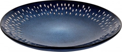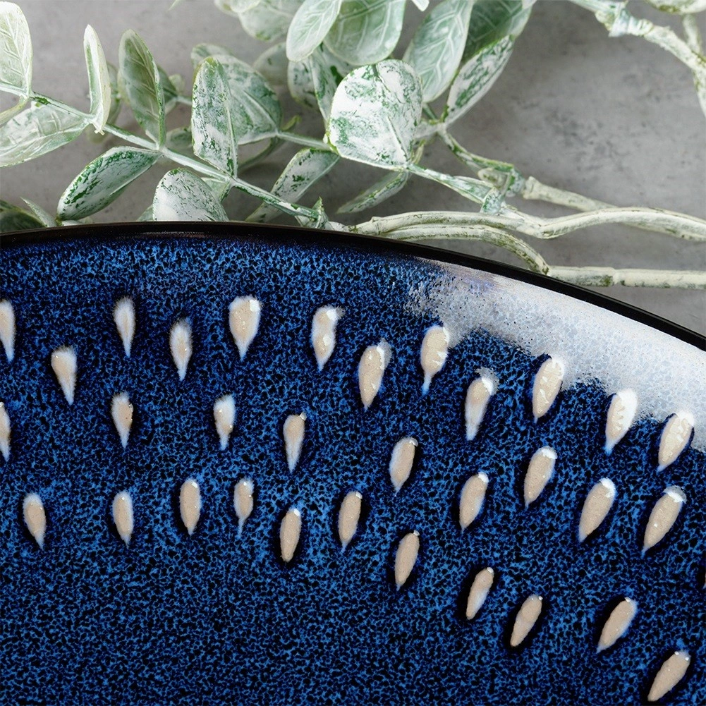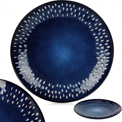 Ovaj stilski plitki tanjur spaja bezvremenski okrugli oblik s izražajnom glazurom u nijansama tamnoplave s granat tonom i suptilnim bijelim akcentima u obliku kapi duž ruba. Kamenina (gres) se odlikuje povećanom čvrstoćom i otpornošću na oštećenja, pa je prikladna za svakodnevnu upotrebu i intenzivan rad.