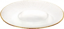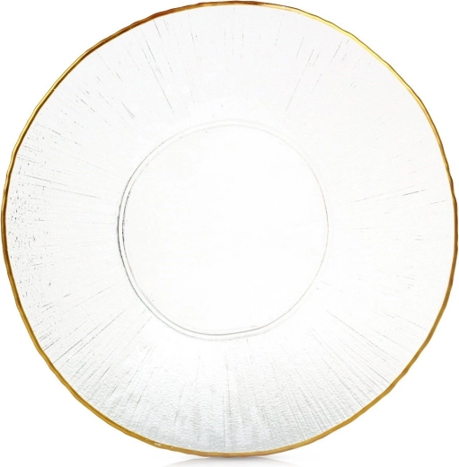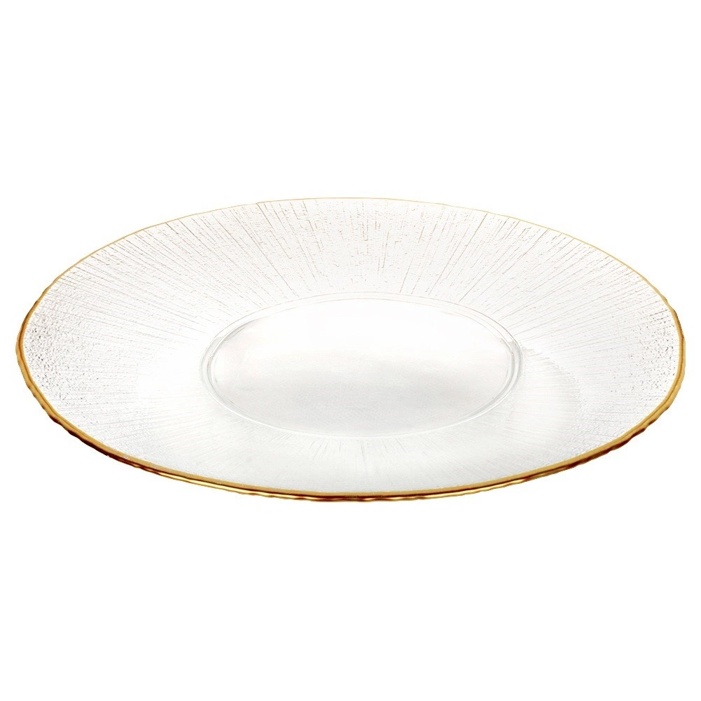 Ovaj univerzalni stakleni tanjur promjera 30 cm ističe se dekorativnim zlatnim obrubom i radijalnom strukturom koja naglašava moderan i luksuzan stil posluživanja. Idealan je za svakodnevnu upotrebu i svečane prigode, gdje odlično služi za posluživanje glavnih jela, deserata te kao estetski stalak.