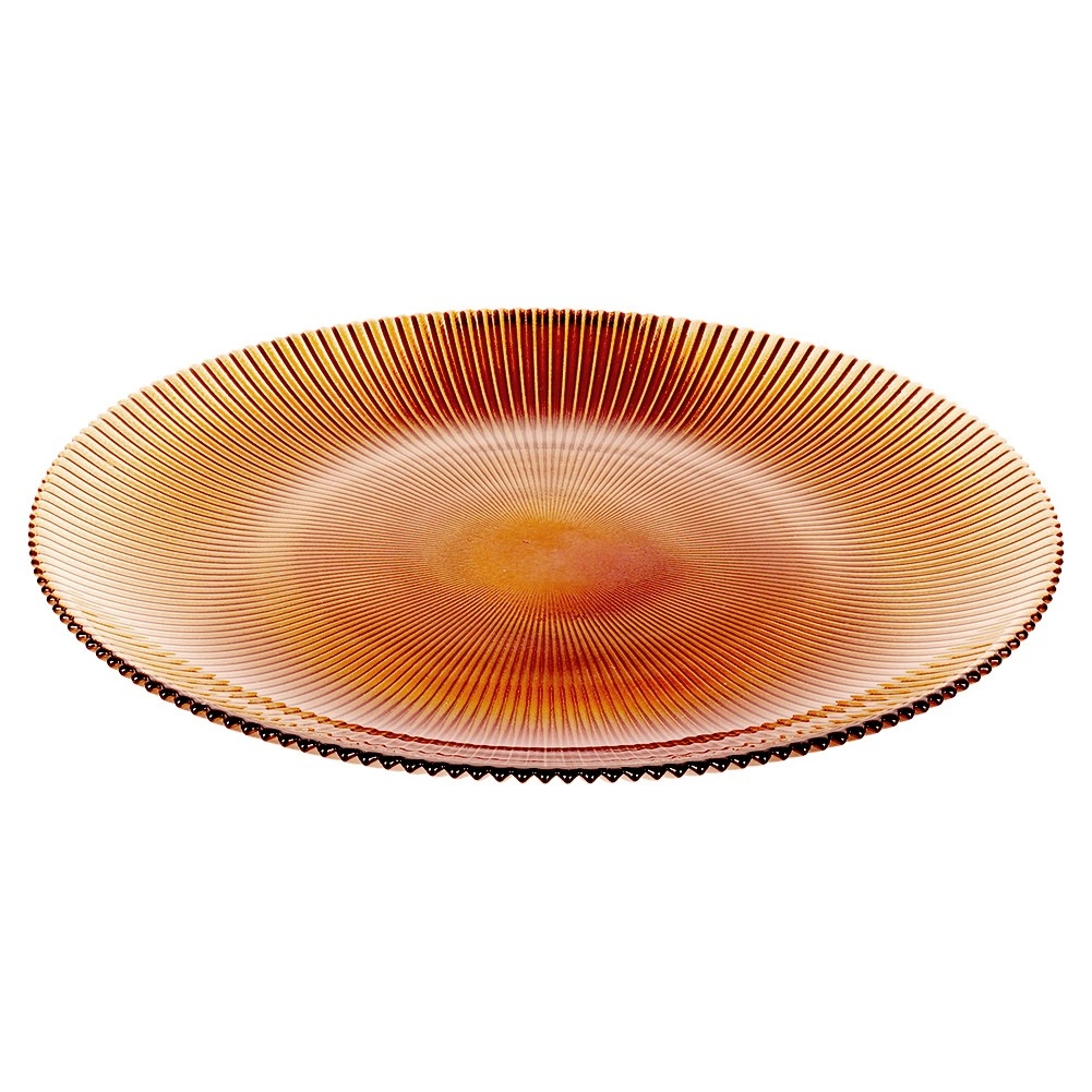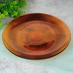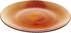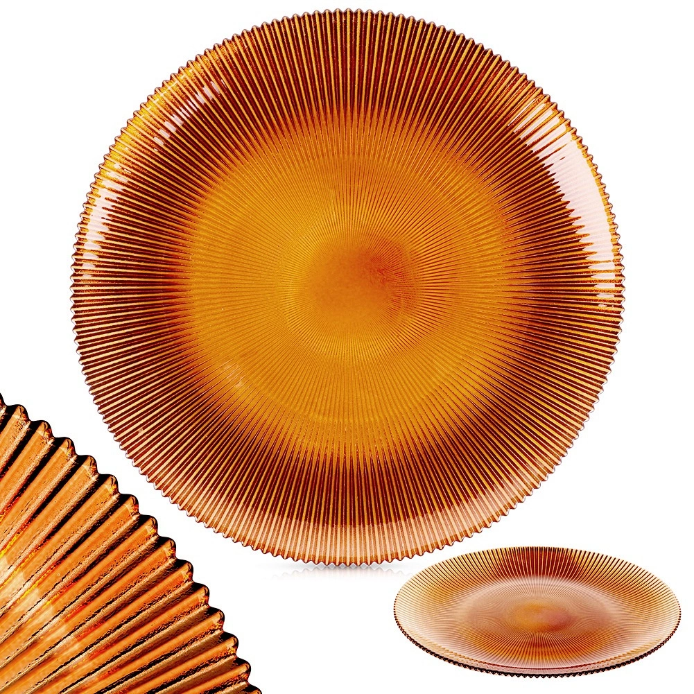 Ovaj jantarni stakleni tanjur 28 cm spaja moderan dizajn i funkcionalnost. Radijalno rebrasto oblikovanje od središta osigurava atraktivan izgled, bolji prihvat i prekrasnu igru svjetla. Prikladan je za svakodnevno posluživanje i svečane prigode.