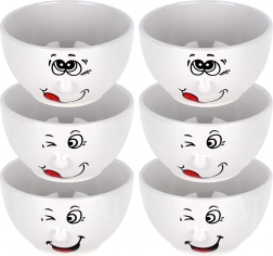 Praktičan i stilski set zdjelica koji oduševljava duhovitim dekorom s licima, a ujedno nudi univerzalnu primjenu za svakodnevno posluživanje. Zahvaljujući zapremnini od 550 ml idealne su za juhe, kreme, müsli, salate i sitne grickalice. Sjajna bijela keramika ističe se u svakoj kuhinji i lako se kombinira s ostalim posuđem.
