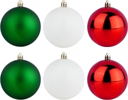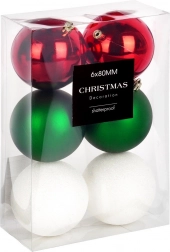Set sadrži uravnotežen miks: 2× crvena sjajna, 2× zelena mat i 2× bijela blještava. Izdržljiva plastična izrada vjerno oponaša staklo, ali je znatno sigurnija i dugotrajnija – idealan izbor za obitelji s djecom ili životinjama.