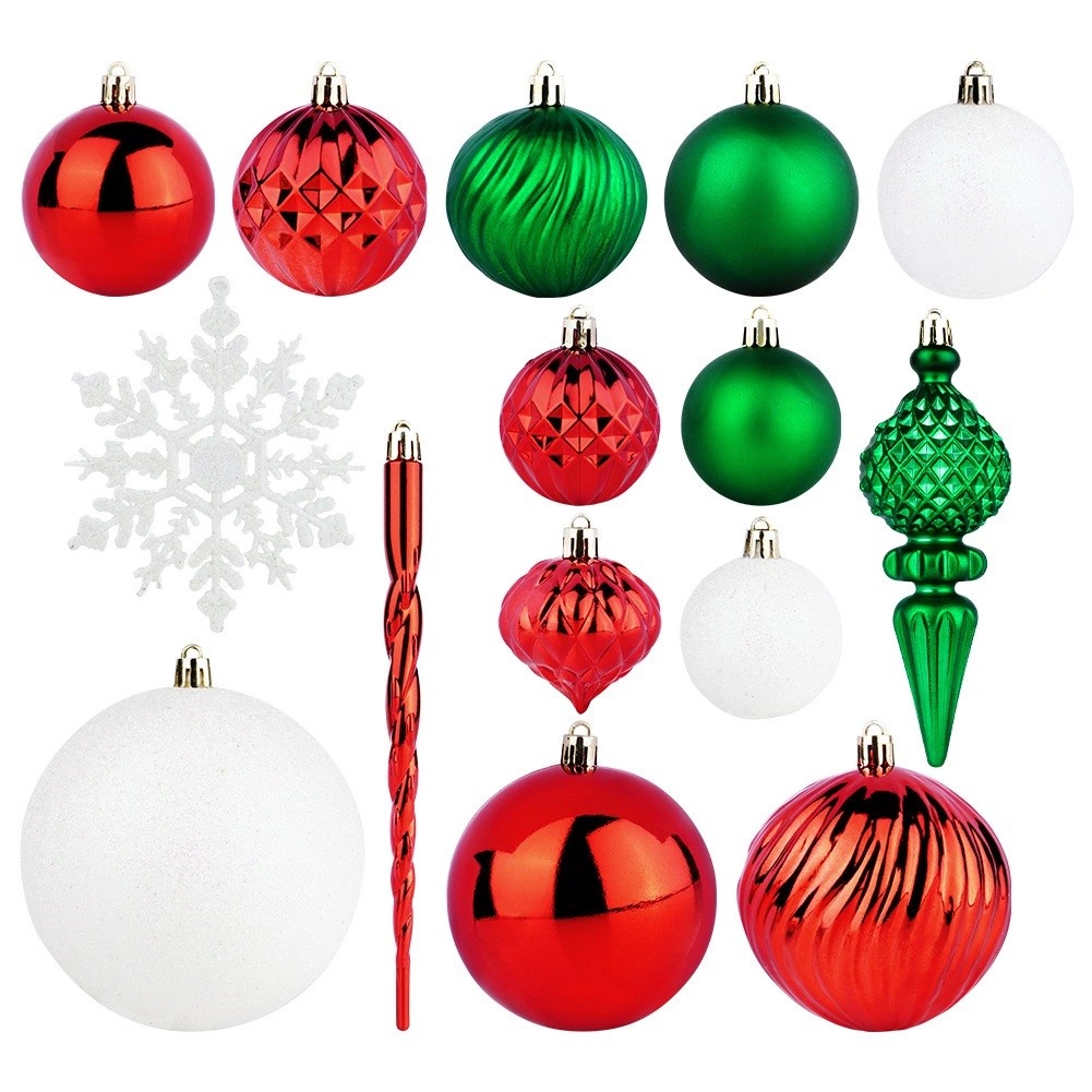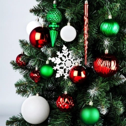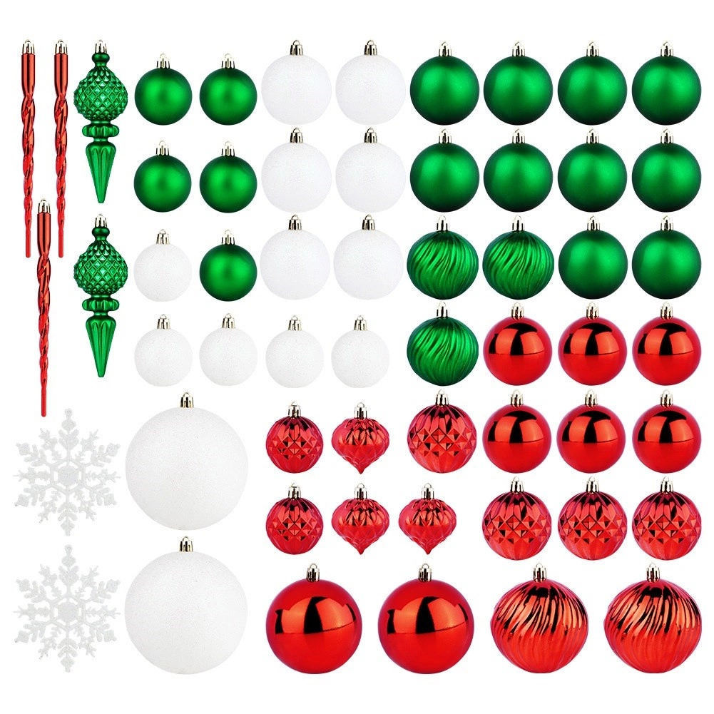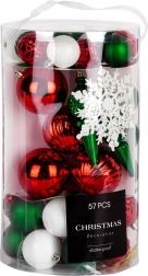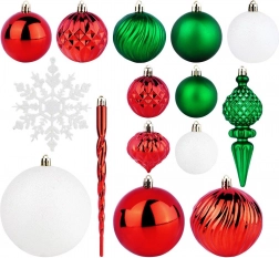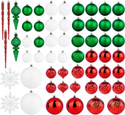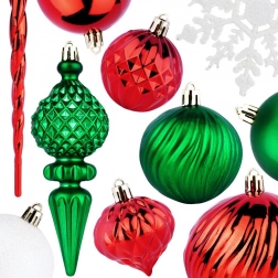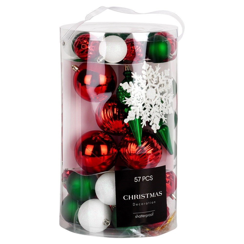 Stilski set od 57 nerazbitnih božićnih ukrasa u crvenoj, zelenoj i bijeloj boji uljepšat će svako drvce. Mješavina sjajnih, mat, svjetlucavih i reljefnih površina stvara bogat, klasičan izgled. Ukrasi od izdržljive plastike sigurni su za djecu i kućne ljubimce, imaju ušice za lako vješanje i dolaze u praktičnom spremnom pakiranju.