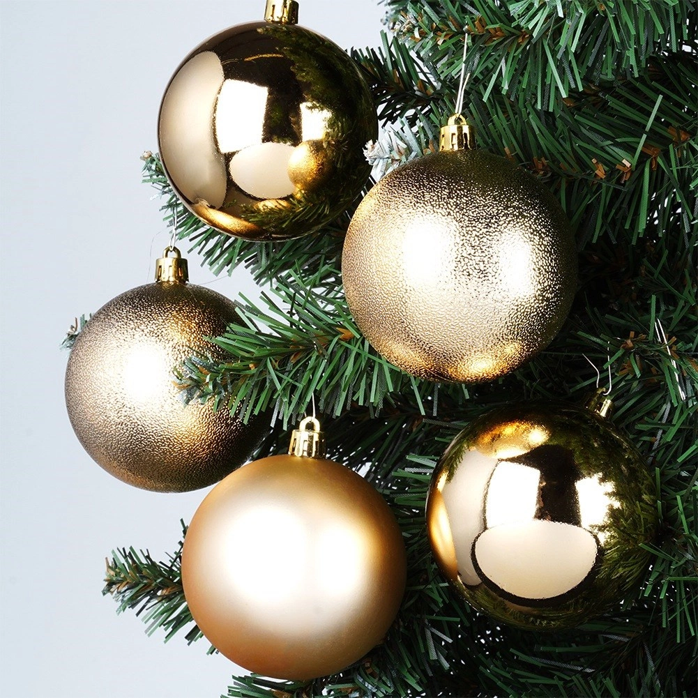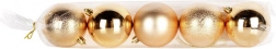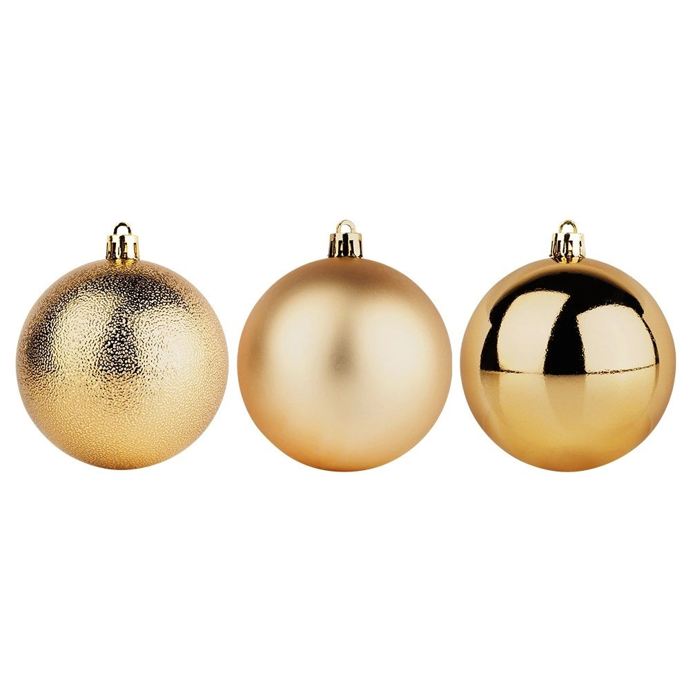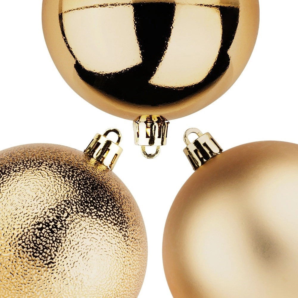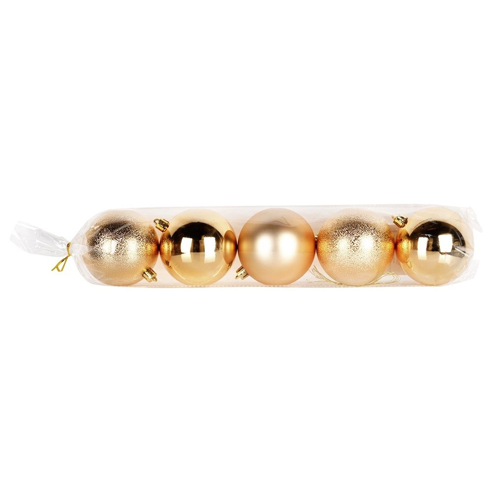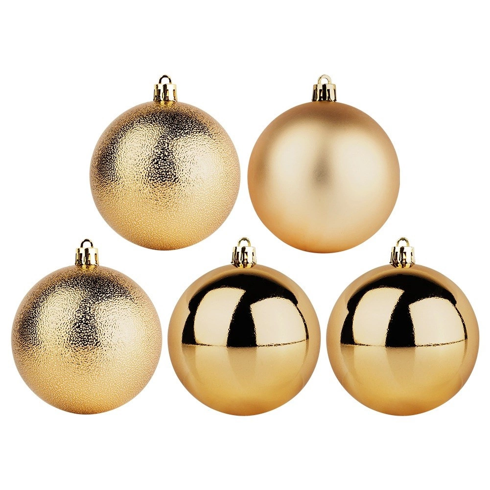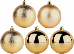 Unesite sklad i sjaj u svoju blagdansku dekoraciju setom od 5 zlatnih ukrasa promjera 8 cm. Izdržljivo nelomljivo izvedenje vjerno oponaša staklo, ali pruža veću sigurnost i dug vijek trajanja. Kombinacija sjajnih, mat i strukturiranih površina stvara efektan kontrast i dubinu dekoracije.