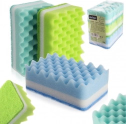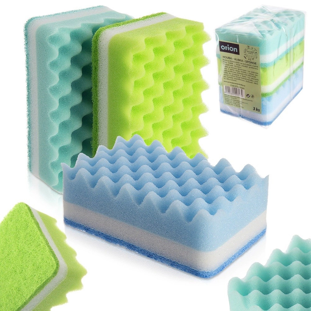 S ovim praktičnim setom od 3 spužvice obavit ćete svakodnevno pranje posuđa, sudopera i kuhinjskih ploha brzo i nježno. Svaka spužvica ima dvije različite strane – meku, valovitu za osjetljive površine i grublju, abrazivnu za učinkovito uklanjanje osušenih nečistoća.