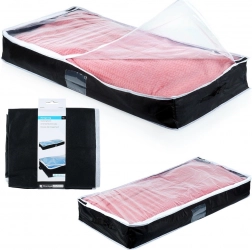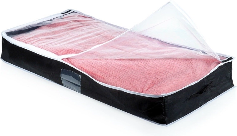 Vreća je opremljena čvrstim duplim patentnim zatvaračem u kontrastnoj bijeloj boji za brz pristup i bočnom ručkom za lako izvlačenje ispod kreveta ili s gornjih polica. Minimalistički dizajn i ravan oblik štede prostor i pomažu pametno organizirati kućanstvo.