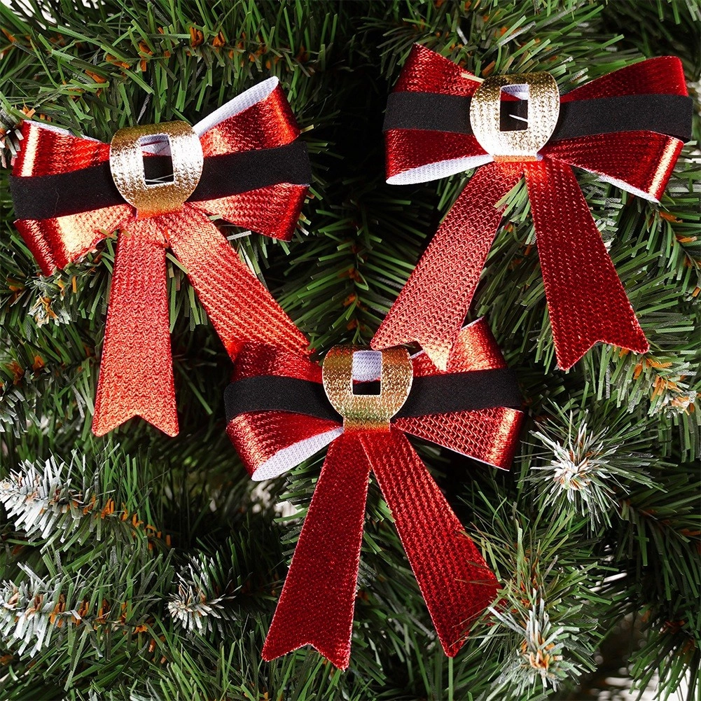 Crvene satenske petlje s crnim remenom i zlatnim detaljem „kopče” stvaraju efekt Santa remena – stilski akcent za bor i interijer.