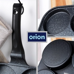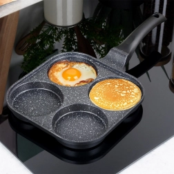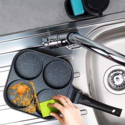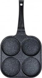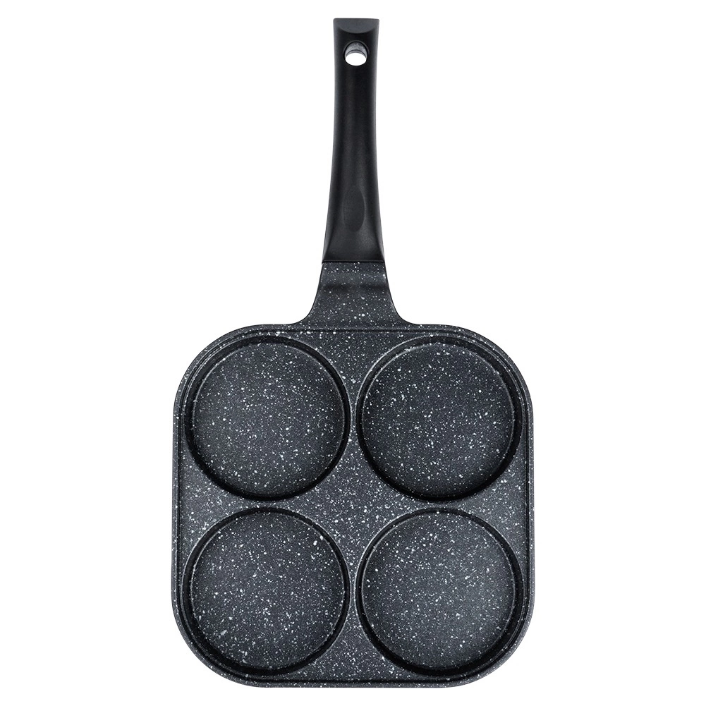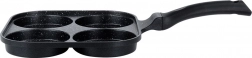 Kvadratna tava 22 × 22 cm s četiri zasebne komore osigurava jednaku veličinu porcija i savršen izgled doručka. Aluminijsko tijelo s granitnim neprianjajućim slojem brzo se zagrijava i izvrsno raspoređuje toplinu, tako da pržite brzo, štedljivo i bez zagorijevanja. Ergonomska, protuklizna drška s otvorom za vješanje jamči udobnu i sigurnu uporabu.