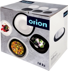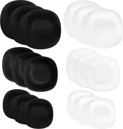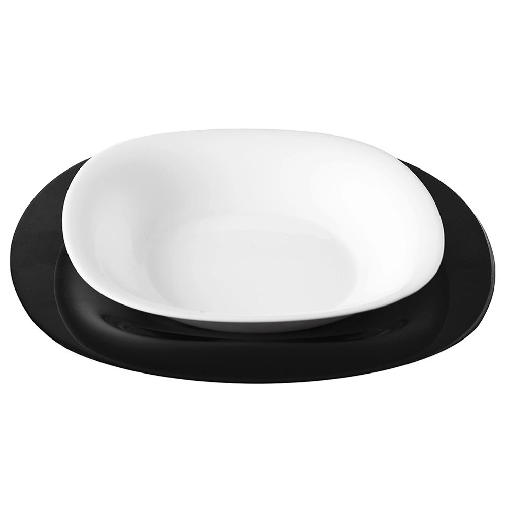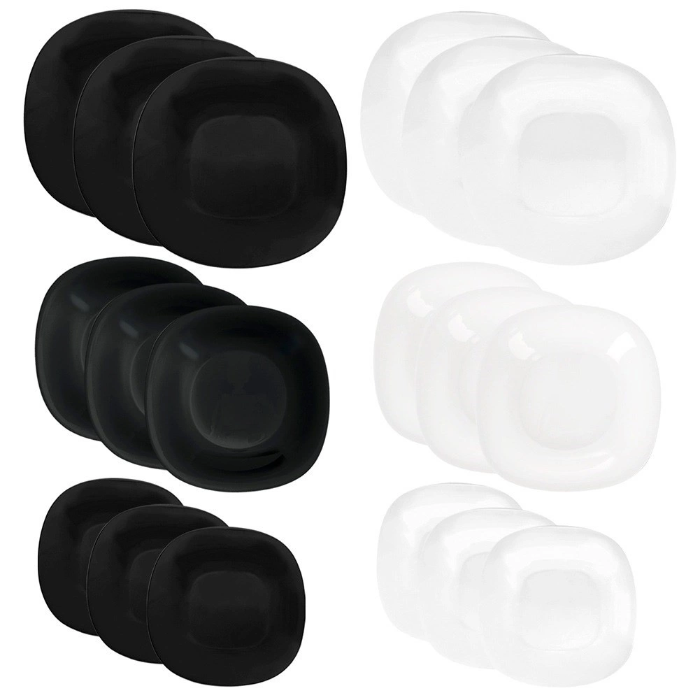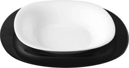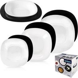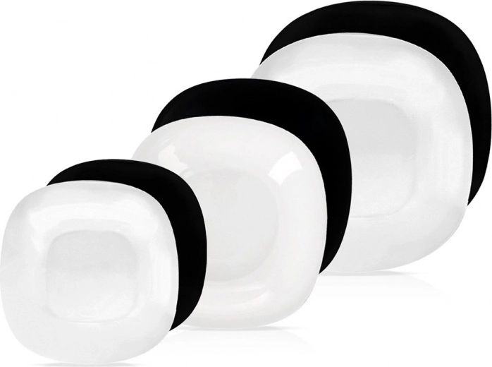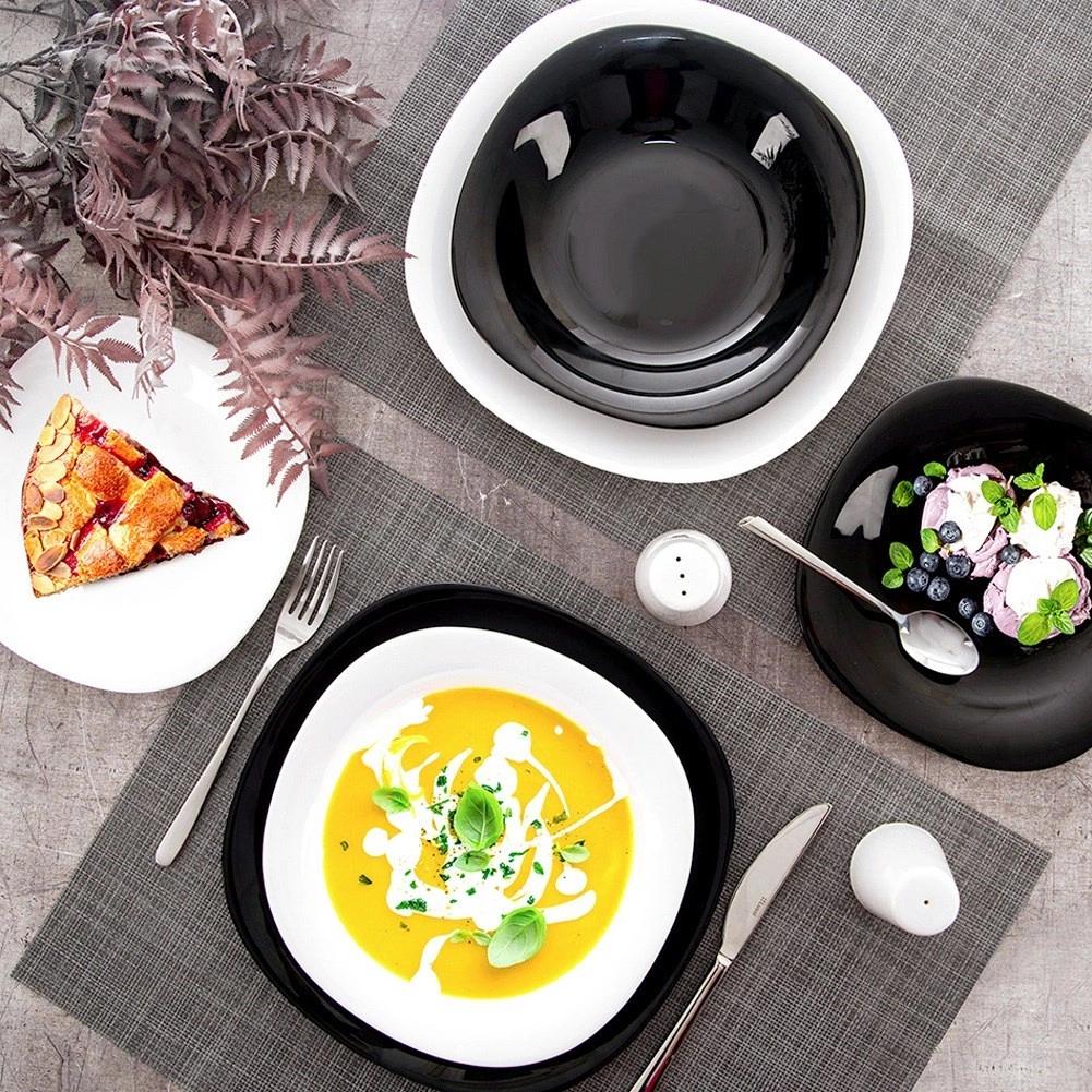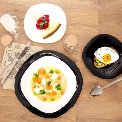 U pakiranju se nalazi sve za cjelovito posluživanje: 6 desertnih tanjurića, 6 dubokih tanjura i 6 plitkih tanjura u skladnom miksu bijele i crne. Zaobljene kvadratne linije daju moderni štih i istodobno štede prostor pri slaganju.