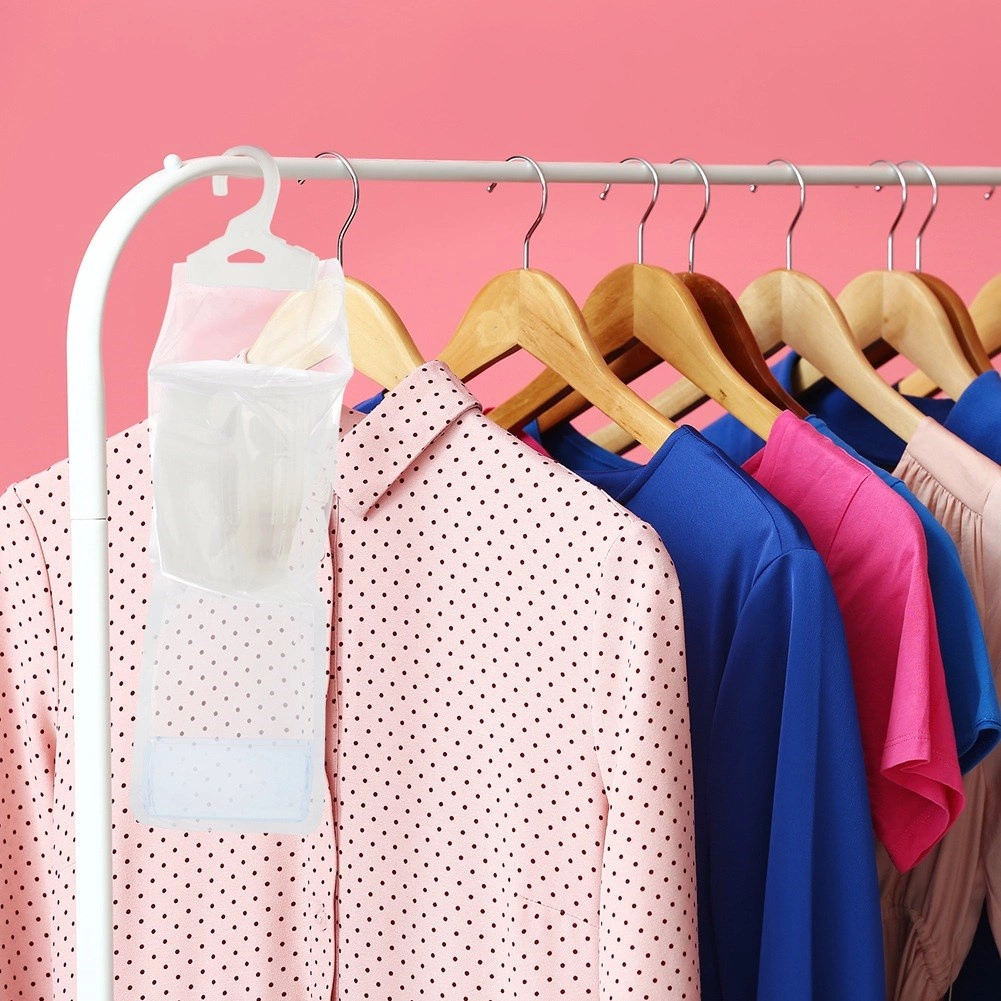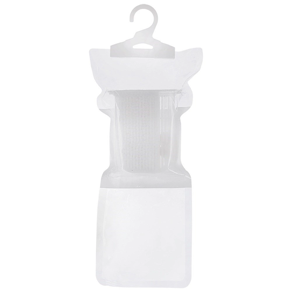 Zahvaljujući praktičnoj kuki lako ga objesite na garderobnu šipku ili zidnu kuku. Apsorpcijski granulat CaCl2 veže vlagu iz zraka i pretvara je u vodu koja se skuplja u donjem dijelu vrećice. Nakon punjenja proizvod je predviđen za zamjenu.