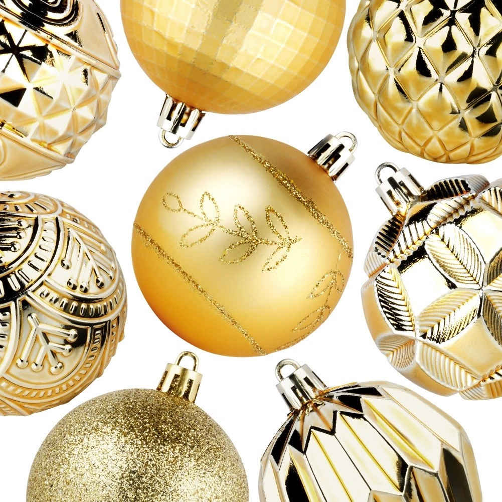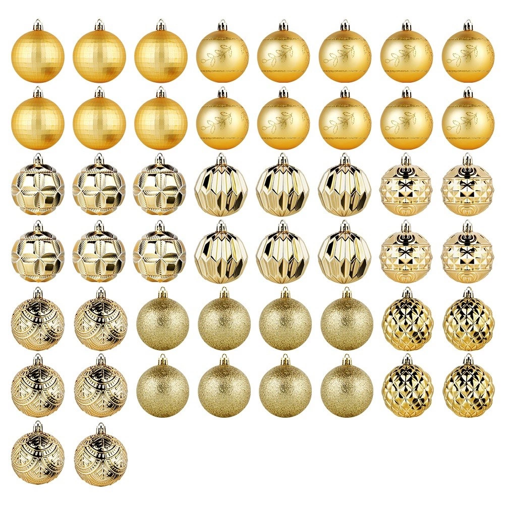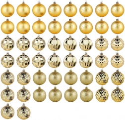 Stvorite čarobnu božićnu dekoraciju uz bogat set od 50 komada u ujednačenoj zlatnoj nijansi. Ukrasi djeluju luksuzno, a zahvaljujući različitim teksturama i dekorima daju boru i aranžmanima dubinu i sjaj. Izrađeni su od izdržljivog materijala koji podsjeća na staklo, ali je sigurniji i trajniji.