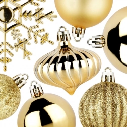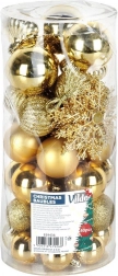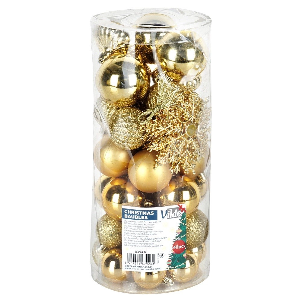 Stvorite jedinstvenu božićnu atmosferu kod kuće sa setom zlatnih ukrasa Vilde. Kuglice su izrađene od kvalitetne plastike, zbog čega su nerazbitljive i znatno izdržljivije od staklenih, a pritom zadržavaju elegantan izgled stakla. Različite površinske obrade u jednoj boji omogućuju skladno, a istovremeno dinamično ukrašavanje bora, vijenaca i girlandi.
